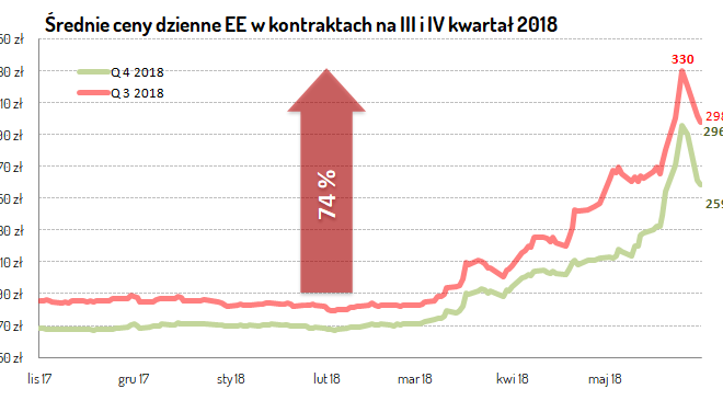 Energia Elektryczna Ceny energii elektrycznej wciąż pną się w górę i szacujemy dalsze wzrosty w kontekście drożejącego węgla, uprawnień do emisji CO2 oraz zielonych certyfikatów. Ocenę sytuacji pozostawimy czytelnikom. Rekomendujemy kupowanie energii, bo będzie jeszcze drożej. Cena MWh w kontrakcie na IV kwartał 2018 roku przekroczyła już 275 zł i kieruje się ku 300 zł/MWh. Ceny uprawnień do emisji CO2 do atmosfery są sprzedawane już powyżej 21 euro za tonę a mogą być jeszcze dwukrotnie droższe. Podobnie ma się sytuacja …..