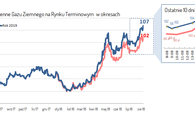 Ceny gazu ziemnego wciąż rosną. Dziś płacimy o około 20 % więcej za gaz niż jeszcze rok temu. W kontrakcie na 2019 rok cena osiągnęła już 107 zł/MWh a sezon grzewczy dopiero przed nami. Czeka nas droga zima i nic nie wskazuje na to aby trend miał się odwrócić. Rosną ceny gazu rośnie cena prądu, cena ropy już jest wysoka. Cieszy się chyba tylko Państwo, które w pełni kontroluje dostawców tych paliw. Przeczytaj również: Drożej, coraz drożej…