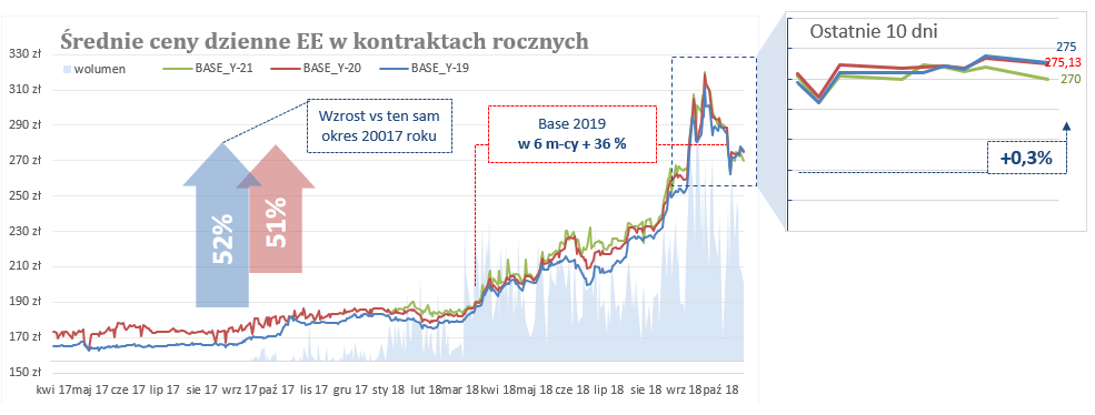 Ostatnie dni na rynku energii pokazały niewielką korektę cen energii elektrycznej w kontraktach na kolejne lata. Dokładnie miesiąc temu cena energii w kontrakcie na 2019 rok osiągnęła najwyższą jak dotąd cenę 311 zł. Od tego czasu jednak cena nieznacznie spadła i ustabilizowała się w okolicach 277 zł/MWh. Nadal jest to znacznie wyżej niż w tym samym okresie zeszłego roku jednak jest to pierwsze wyraźne przełamanie bardzo gwałtownego trendu wzrostowego trwającego niezmiennie od marca. Od prezentowanych poniżej cen hurtowych jest jeszcze bardzo daleko do cen oferowanych odbiorcom końcowym jednak każda pozytywna zmiana w tym obszarze ma przełożenie na ceny końcowe. Do stawek energii prezentowanych na wykresie należy doliczyć akcyzę oraz kolejne certyfikaty co ustawia nam poziom cenowy na poziomie około 370-400 zł/MWh dla odbiorcy końcowego.