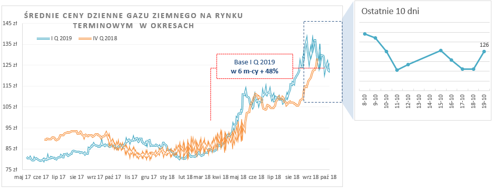 Podobnie ma się sytuacja z ceną gazu na I kwartał 2019, czyli na okres zimowy, kiedy jest niewątpliwy szczyt zapotrzebowania i cena się zatrzymała na 126 zł/MWh.