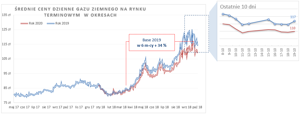 Ceny gazu ziemnego wzrastają wraz z cenami ropy na stacjach benzynowych i aktualnie kształtują się na poziomie ok. 117 zł/MWh na 2019 rok, co daje wzrost o 34 % w stosunku do poziomu z kwietnia 2018.