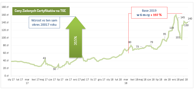 Ceny zielonych certyfikatów na giełdzie TGE przedstawia wykres poniżej. Stawki po chwilowym załamaniu znów pną się w górę, osiągając już ponad trzykrotny wzrost w stosunku do tego samego okresu zeszłego roku.