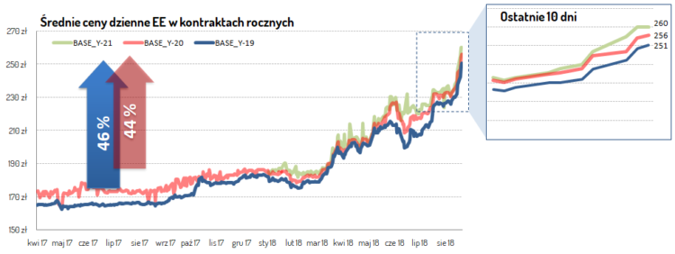 Jak pokazuje poniższy wykres ceny energii w kontraktach terminowych w stosunku do zeszłego roku wzrosły o 44-46 % !!! W skali 10 dni ceny wzrosły o ok. 10%. Jeżeli tak dalej pójdzie pod koniec roku ceny energii przebiją barierę 300 zł.