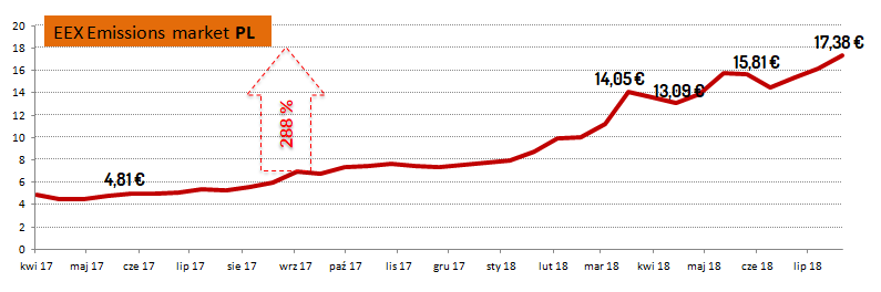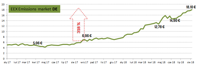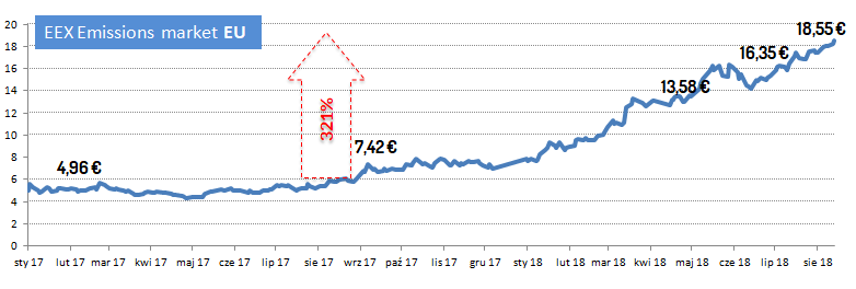 W cenie czarnej energii zawarte są uprawnienia do emisji CO2 do atmosfery, które w ostatnich dniach również zdrożały. Wydawało się ze cena 15 euro za tonę to już bardzo wysoka stawka, tym bardziej ze rok temu wahała się w okolicach 5-6 euro. Cena emisji na europejskim rynku osiągnęła 18,5 euro za tonę.