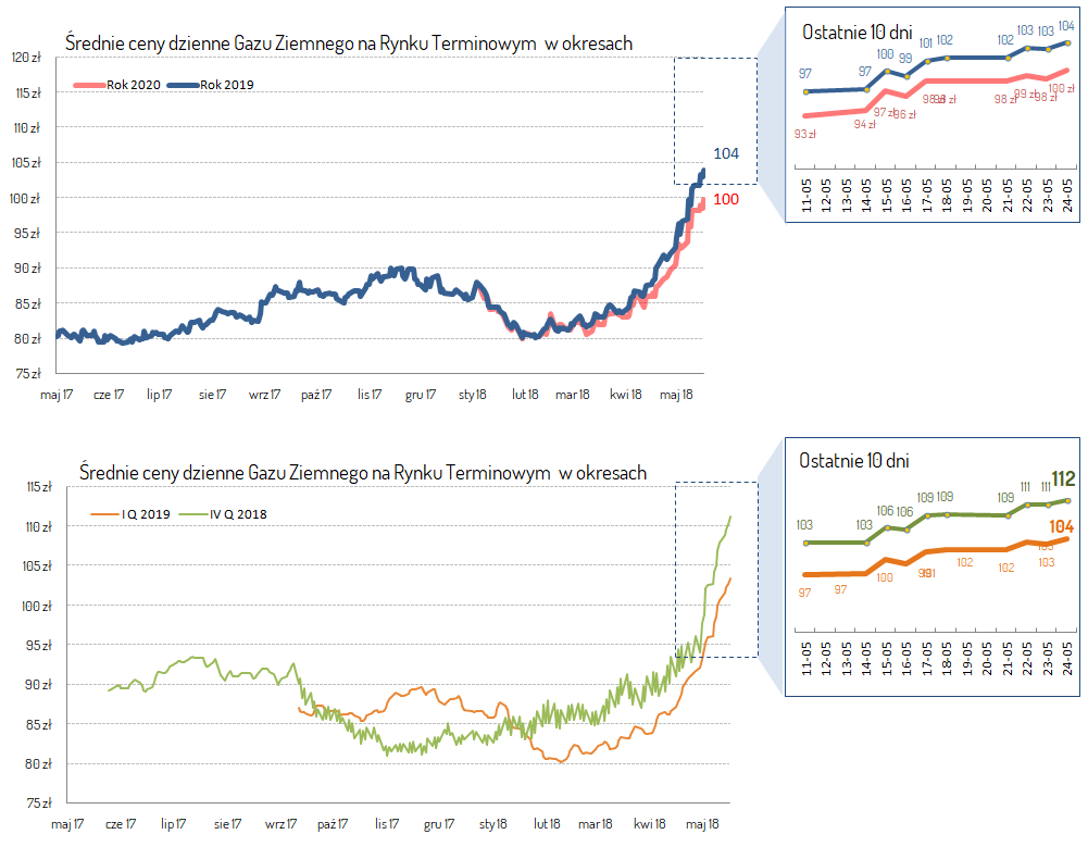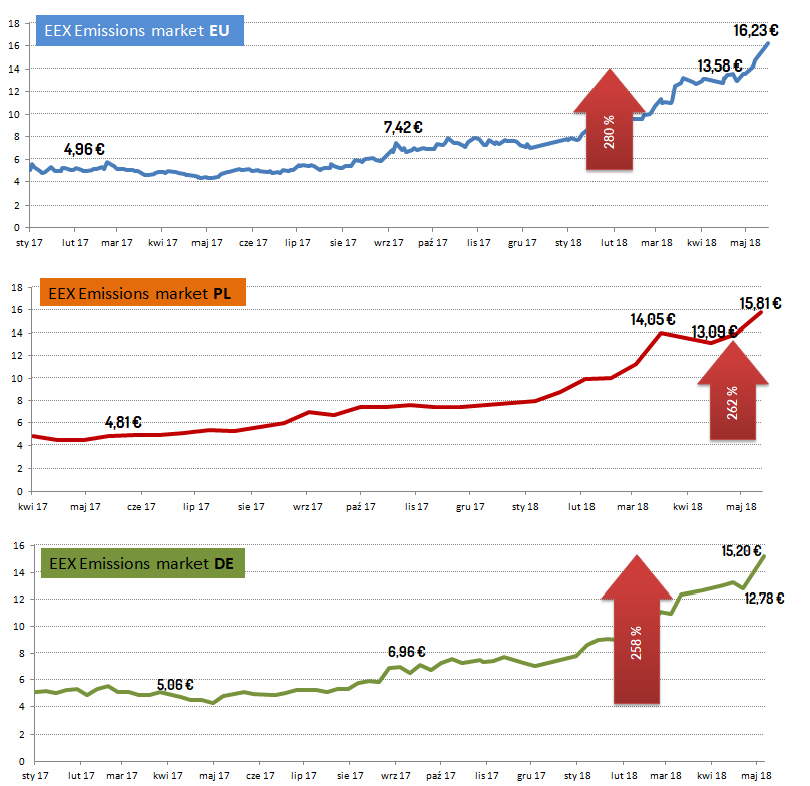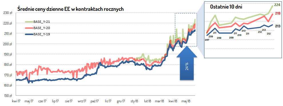Przez dwa tygodnie od naszego poprzedniego wpisu energia elektryczna i gaz wzrosły w hurcie analogicznie o 3% i o 8 %. Pisząc o rekordach w cenach energii mieliśmy na myśli stawki na poziomie ok 205-207 zł/MWh . Teraz energia elektryczna bez akcyzy i certyfikatów kosztuje już 213,7 zł/MWh (średnia cena transakcyjna na TGE z 24/05/2018 w kontrakcie na 2019 rok). Taki poziom cen oznacza, że w 3 miesiące energia zdrożała o 20%! Podobnie sytuacja ma się na rynku gazu ziemnego z 96 zł/MWh skoczył na 104 zł/MWh. Dość droga zima nam się szykuje ponieważ na IV kwartał 2018 cena bazowa gazu ziemnego sięgała 112 zł/MWh.