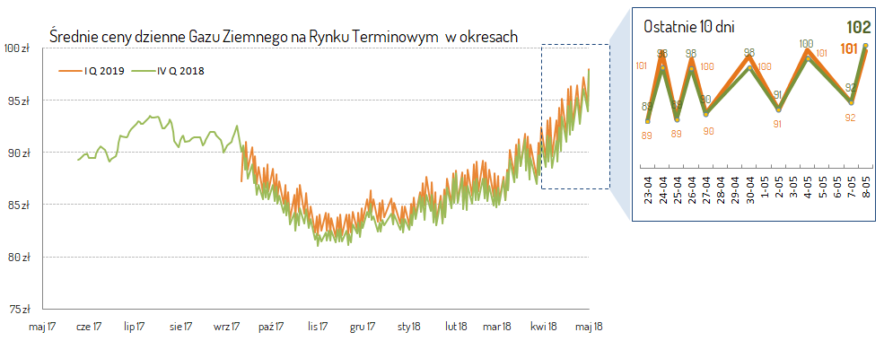 Wyższe ceny gazu są natomiast na sezon grzewczy czyli na IV Q 2018 – I Q 2019 i kształtują się na poziomie ok 101-102 z/ MWh i wciąż rosną.