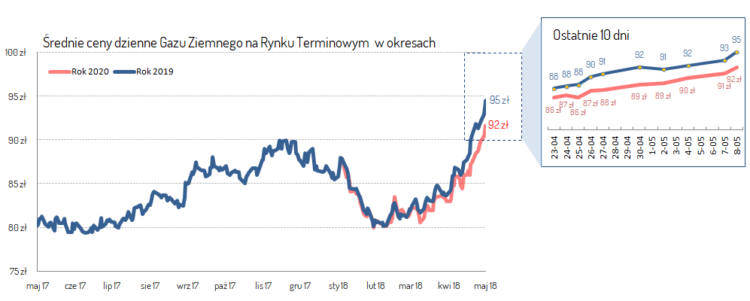 Jak to przy gazie cena jest uzależniona od sezonu i zawsze jest wyższa w okresie grzewczym jednak ten okres mamy już za sobą. Jeszcze w lutym nikt się nie spodziewał takich wzrostów i gaz można było kupić na 2019 rok po cenie hurtowej około 80 zł. Teraz mimo że jest już po okresie grzewczym trzeba za tę samą MWh zapłacić już 95 zł. Po doliczeniu akcyzy mamy cenę 98,6 średniorocznie. A to wszystko bez marzy sprzedawcy, który przecież też musi coś na tym zarobić. Martwi sytuacja że obecne ceny są znacznie wyższe niż w zeszłym roku w tym samym okresie a także ze są wyższe niż w szczycie okresu grzewczego.