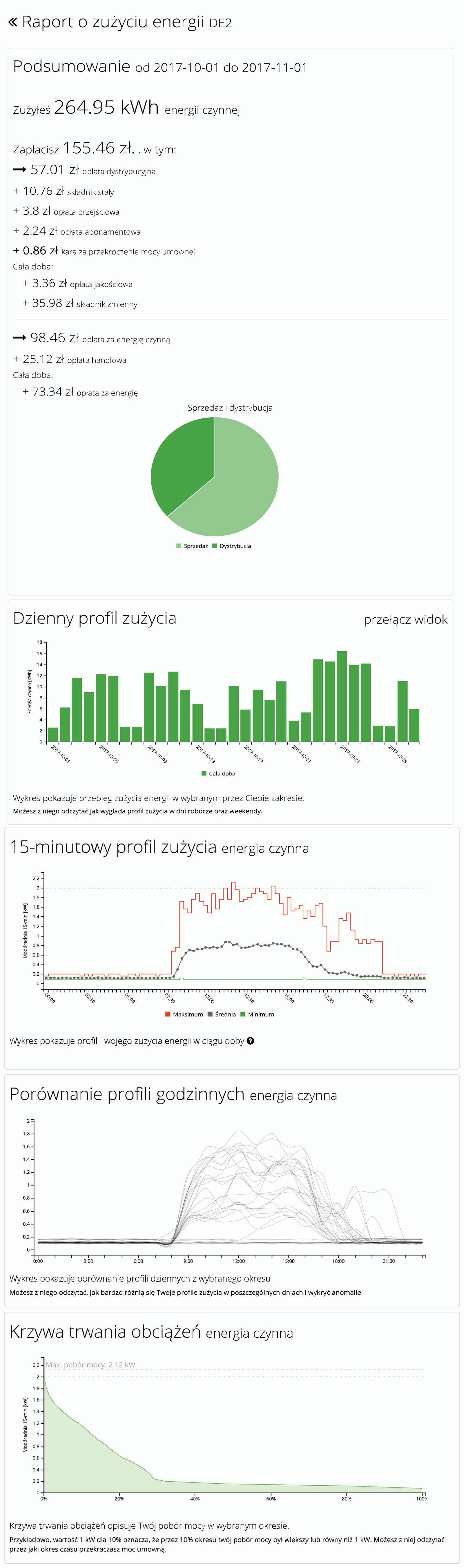Oto przykładowy raport wygenerowany z aplikacji za miesiąc październik. Takie raporty możemy generować za dowolny okres i otrzymamy pełną analizę zużycia oraz kosztów energii.